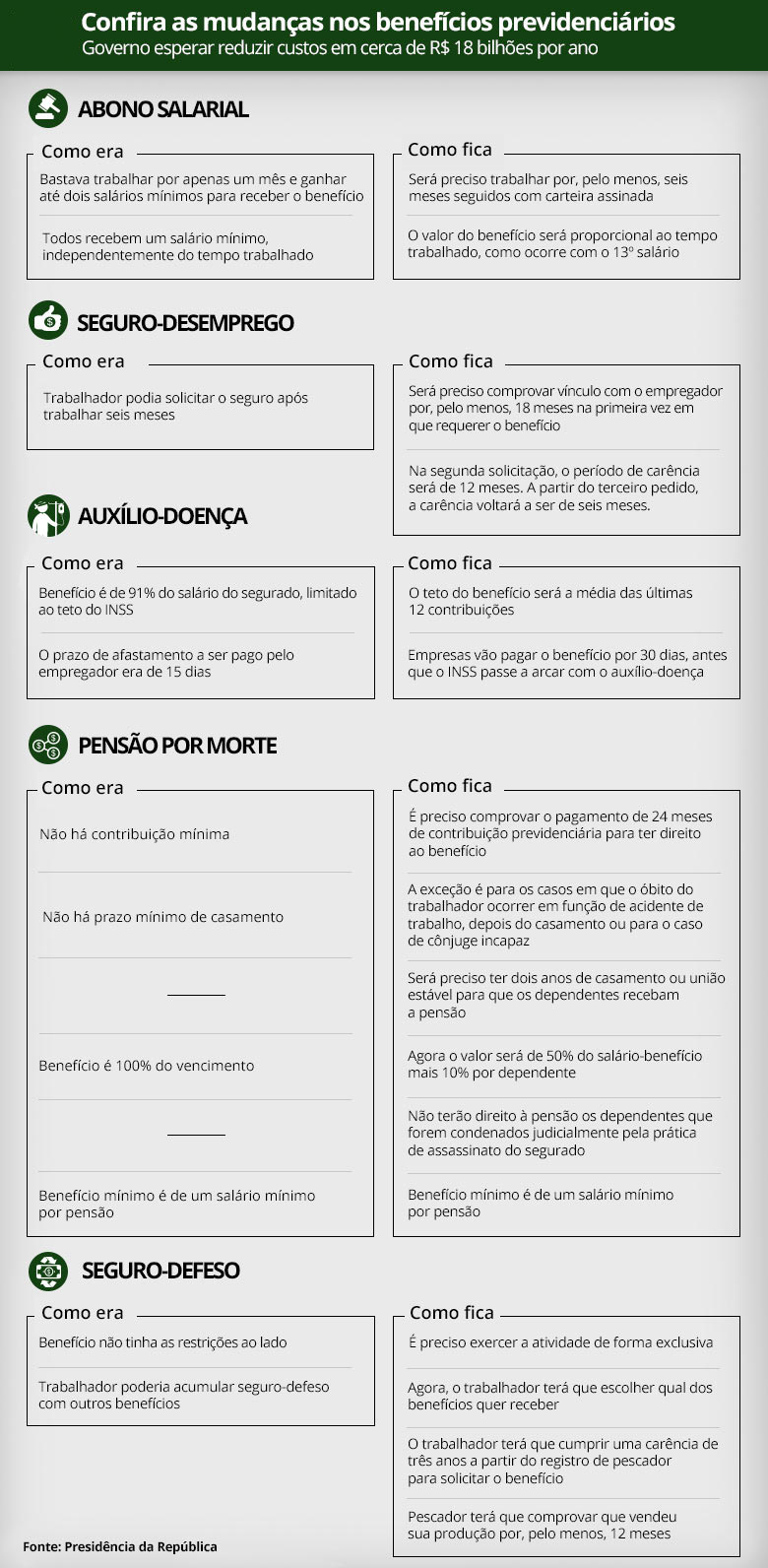 O governo decidiu alterar as regras para receber cinco benefícios trabalhistas e previdenciários para eliminar excessos, aumentar a transparência e corrigir distorções. Entenda abaixo as mudanças do abono salarial, do seguro-desemprego, do seguro-defeso, da pensão por morte e do auxílio-doença.